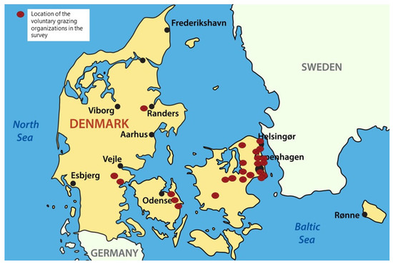 This exploratory study includes survey data collected from members of 25 grazing organizations, which are geographically distributed across Denmark, but with the majority located in the Northeastern part of Zealand, supplemented by a few on Funen and in Jutland (Figure 1). All organizations allowed a questionnaire to be circulated among their members and the answers were used as the primary data in this study (n = 347).