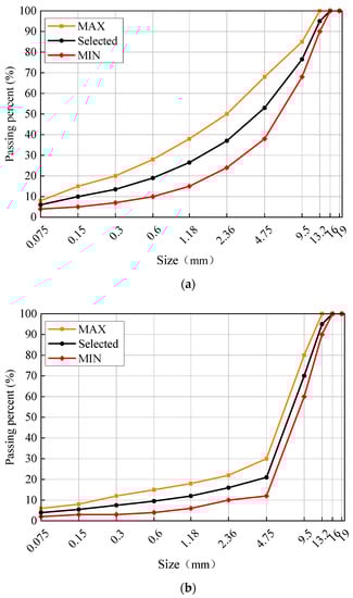 Gradation curves of (a) AC-13 and (b) OGFC-13.