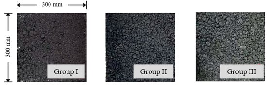 During the test, the specimen was fixed in the slot of the workbench, and the surface of the specimen was flush with the workbench. The silica sand was selected as the polishing medium, since previous research has demonstrated that the silica sand can best simulate the effect of pavement dust. A total of 50 g of silica sand was uniformly distributed on the specimen surface through the dispenser system. The water was continuously sprayed at the rate of 60 mL/min through the sprinkler in the dispenser system during the loading process to cool the wearing system and reduce the wearing noise. The contact pressure between the tire and sample surface was set as 1500 N, and the rotation rate of the tire was set as 100 rad/min. The major parameters for the wearing test are given in Table 2. The determination of the parameter values was based on our previous research in combination with a trial-and-error test [,,]. Each wear test cycle was 30 min, and 5 cycles were carried out for every specimen. The wearing products were collected for subsequent analysis after every cycle test.