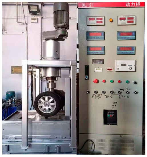 The wearing tests were conducted by the Harbin Advanced Polishing Machine (HAPM), as shown in Figure 3. The HAPM contains six units: an acceleration system, loading system, workbench system, dispenser system, protection system and operation control system. The acceleration system was used to set the loading rate and provide power for the tests. The radial tire (185/60 R 14, produced by Giti Company) was used for the HAPM test in the current study. The section width, aspect ratio and hub diameter of the tire are 185 mm, 60, and 14 inches, respectively.