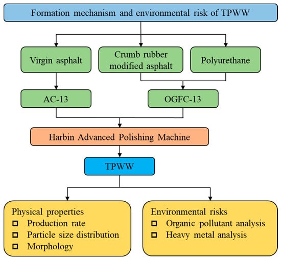 In the service life of pavement, due to the wearing interactions between vehicle tires and pavement surfaces, the wearing of vehicles’ mechanical parts, the deposition of vehicles’ gas emissions and atmospheric dust, and other reasons, pollutant particles accumulate on pavement surfaces. Among all of these potential sources, the wearing waste particles from the interaction of vehicle tires and pavement surfaces are the main contributors to the quantity of pollutants. TPWW is mechanically generated by the rolling shear of a tire against a pavement surface, and it comprises tire wear, road wear, and brake wear [,]. The pavement surface runoff carries a great number of these pollutants and flows through the surrounding soil and water bodies, which causes the accumulation, transmission, and migration of the pollutants in the road area. Unlike the point source pollution from industrial wastewater and urban sewage, which can be uniformly collected and centrally treated, road area pollution is a scattered, sparse plane network system, which greatly increases the difficulty of controlling the pollution.