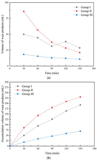 The measured volumes of the TPWW after every 30 min of polishing duration are shown in Figure 5. It can be easily found that the amount of TPWW generally decreases as the polishing procedure continues. The exception is that of group I at the end of the 120 min polishing duration. The slight increase in the TPWW at the end of the 120 min polishing duration was found to be resulted from the stripping of aggregates by observation. The results from Figure 5b indicate that the polishing resistance of the polyurethane (PU) mixtures is better than that of the bituminous mixtures, and the polishing resistance of the AC-13 asphalt mixture is better than the OGFC-13 asphalt mixture.
