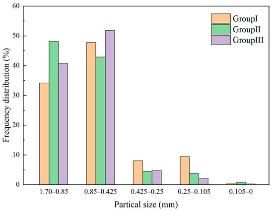 The wearing products directly collected from the HAPM test contain a certain amount of particles whose sizes are greater than 1.7 mm. However, this fraction of TPWW was eliminated during the following analysis due to the following reasons: (i) this fraction of particle is the mineral aggregates directly stripped from the test sample surface, and they are very different from the wearing products in terms of formation mechanism; (ii) these particles are of higher volume and mass values than that of the finer particles, and they will hold a dominant position in both volume and mass of the total wearing products if they are taken into consideration. However, these particles hardly contribute to the organic contaminant and heavy metal elements of the road area environment. The remaining fraction (size smaller than 1.7 mm) constitutes both aggregate and rubber wearing particles. They were divided into five groups which were of the particle size range of 0~0.105 mm, 0.105~0.25 mm, 0.25~0.425 mm, 0.425~0.85 mm, and 0.85~1.7 mm, respectively. The identified particle size distributions of different groups of TPWW are shown in Figure 6. It is found from Figure 6 that the coarse particles (0.425~1.7 mm) dominate the TPWW regardless of the asphalt mixture type, which accounts for nearly 90% of the total collections. Among the three sample groups, group I is of the least content of coarse particles which can be attributed to the denser microstructure of the AC-13 asphalt mixture.