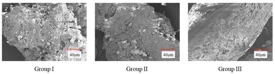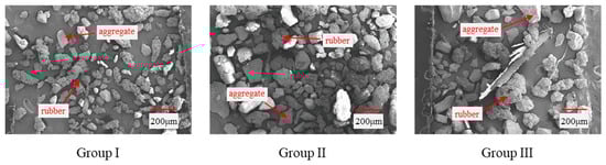 The morphology of the fine particles (smaller than 0.425 mm) was characterized through SEM, and the results are shown in Figure 7 and Figure 8. The selection of the fine particles was based on the fact that the TPWW of a diameter smaller than 500 µm can be well dissolved in water media, as has been demonstrated in previous research []. The mesoscale morphologies (see Figure 7) of the TPWW indicate that the finalized materials were composed of varying-sized and irregular-shaped rubber particles from the tire, as well as uniform-sized and angular fine aggregates. The microscale morphologies (found in Figure 8) of the fine aggregates and rubber particles exhibit significantly different features. The rubber particles were obviously porous, with a great number of fine fillers adsorbed on the surface. The aggregation phenomenon of the fine fillers can also be observed in certain regions. On the other hand, the aggregate particles had relatively smooth surfaces and profound angularity.