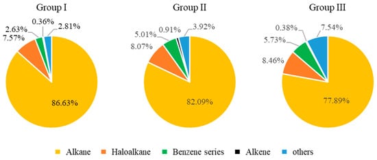 The measured results of the gas chromatography test for the three groups of samples are presented in Figure 9, Figure 10 and Figure 11, respectively. The mass content of each component was determined by the gas chromatography area, and the calculation results are shown in Figure 12. It is seen that the alkanes account for nearly 80% of the total TPWW matters, followed by the haloalkanes (8~10%). The benzene series with stronger toxicity shows a relatively low content of no more than 5%. The contents of alkenes for the three groups are generally no more than 1%. The remaining matter includes some esters, ethers, alcohols, etc. The group II sample is found to contain more benzene series substances compared to the group I sample. The increased benzene series substances are introduced by the use of crumb rubber modifiers. The substitution of polyurethane as the binding material leads to a decrease in the content of alkanes as well as an increase in benzene series substances. The group III sample shows the highest content of remaining substances (7.54%). This is resulted from the increased esters and aldehydes (including methyl stearate, petroselinic acid methyl ester, benzaldehyde, etc.) which are the by-products of polyurethane.