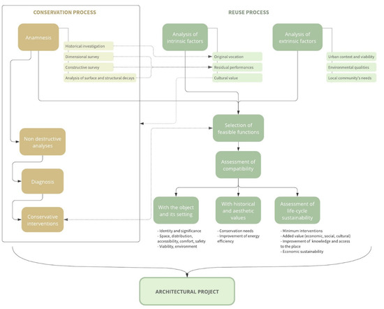 By combining two different phases, parallel and both underpinned by accurate knowledge of the building, an overarching architectural project is defined. The first route is focused on a survey of the material consistency of the building with the purpose of conserving and protecting the authenticity of materiality and construction techniques used. The second uses the result of the survey to evaluate and compare new possible functions to assess their compatibility and select the one that appears to be more sustainable and effective in exploiting the underestimated value of the heritage [45,46,47].