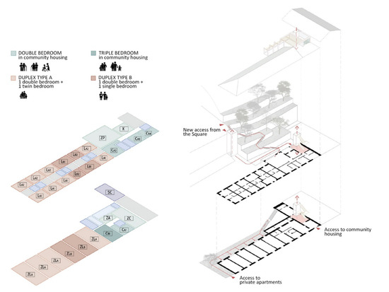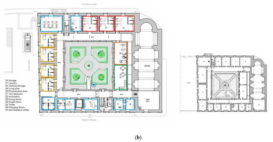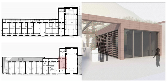 The project focused on providing the new users with two types of accommodation: one for a long-term stay and one for a shorter-term stay, so as to address the needs emerged from data provided by the hospital’s administrative office about the average length of hospitalization [58]. Two crucial points have been addressed: on one side restoring the legibility of the original architectural shape was highly desirable, therefore the choice of removing the inconsistent additions built from the second half-century and replacing them with a new volume responding to a minimalistic and respectful architectural style, with the aim of improving access, quality of open spaces and increase natural light and ventilation (Figure 4); on the other side, the interior layout has been redesigned in order to host the new function focusing on accessibility, taking into account users with reduced mobility or perception disorders. To do so the plan remains as simple as possible, with minimized distribution spaces and strong visual connections between common areas in order to facilitate spontaneous spatial orientation and reducing confusing routes (Figure 5). At the same time, particular attention has been paid to offering the users the choice of having their privacy or using the common areas to socialize and find support by sharing their experiences.