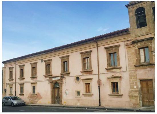 The Convent of the Minor Friars of Grammichele (Figure 6) was built at the end of the 18th century. Featuring a central courtyard, with stone pillars and rounded arcs, the building’s layout was, as usual for monastic buildings, organized in two floors, where the ground floor hosted daily duties and routines, while the upper floor was used as a dorm. After 1866, when orders and religious corporations were suppressed, their assets were seized by the new-born Kingdom of Italy. The Convent of Grammichele was no exception and its government was given to the municipality who carried out demolitions and modifications to adapt it to host an elementary school for women.