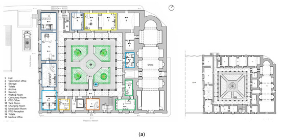 One of the strengths of our case studies is that they have great potential not only in immaterial but also in material terms. Buildings such as convents, monasteries and others collateral to churches generally have distinctive layouts, deriving from consolidated modes of building, with considerable extension and a large number of rooms connected with effective distribution spaces. They often feature cloisters or gardens providing the beneficial effects of green spaces, high-quality constructive techniques and can potentially reach high standards of exposition, natural lighting and ventilation, in order to comply with the requirements imposed by current technical standards. In our case studies, that responded to the abovementioned qualities, the detected conservation status was such as to determine that they required minimum interventions to be adapted to new collective uses. Additionally, they have strong physical relationships with the built environment, in terms of accessibility, connections to close places of interest, and are embedded in the historic cores of their town. This can be a key factor for them to become the core of a network of facilities providing social healthcare—related benefits for the community, in this case.