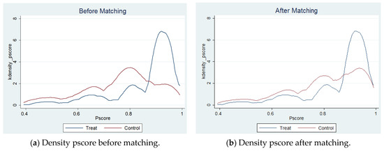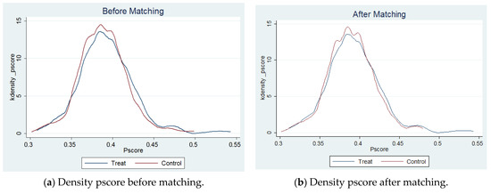 The assumption that the PSM satisfies equilibrium and common support needs to be tested. Among them, the PSM balance test, as shown in Table 4, demonstrates that all standard deviations of the remaining covariables, except the patent protection index, decrease. Their values are 3.2%, 0.8%, 3.2%, and 4.4%, respectively. They are all less than 5%. Therefore, we can conclude that the experimental group and the control group are balanced after the match which passes the equilibrium test. With the same covariable and using the number of invention patents granted as the outcome variable, the same conclusion can be drawn in the balance test. This confirms that outcome variable, covariable, and the radius matching method are reasonable.
