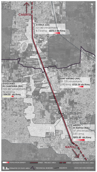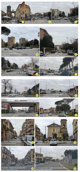 The study presented here utilizes the very detailed and comprehensive database developed in the “Green street framework for marginal Mediterranean urban areas,” to specifically evaluate extending bicycle and pedestrian pathways to revise local mobility patterns while integrating green infrastructure to reduce or eliminate flood risks, urban heat island effects, and CO2 concentrations. The research case study comprises a stretch of the Italian State Road (Strada Statale) 7 bis connecting the two largest provinces of Campania, from Naples to Caserta, crossing the municipalities of Melito di Napoli, Giugliano in Campania, Sant’Antimo, and Aversa (Figure 1). The State Road 7 bis traverses very different urban conditions, from historic centres to unregulated peri-urban expansion (Figure 2), providing an assessment of a wide variety of conditions and complexities to test the feasibility and effects of road redesign to combine alternative mobilities and environmental amelioration. The University of Campania Luigi Vanvitelli resides in Aversa; the study addresses very apparent, if not urgent, local urban environment issues.