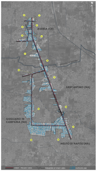 The study area (Figure 1 and Figure 2) is in the central sector of the Campania Plain, a 6.5 km length of roadway between the towns of Melito di Napoli (SE), Giugliano, Sant’Antimo and Aversa (NW), 40°55′08” N latitude–14°13′59″ E longitude and 40°58′24″ N latitude–14°12′28″ E. The S-N average elevation ranges from 89 to 39 m a.s.l., and the average gradient is 2.2%.