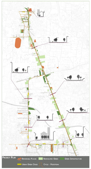 A combined consideration of road cross-sections, urban morphology (i.e., dense historic town centres, dispersed unregulated structures, agricultural land, etc.), public parcels, and the location within urbanized hydrologic subbasins forms the study’s units of analysis and the redesign of the State Road 7 bis (Figure 5). The data analysis recorded, assessed, and quantified existing environmental conditions of each unit (such as slope, existing vegetation, drainage and flood patterns, urban heat island, land use context, etc.) and assessed and quantified the effects of the proposed design interventions in order to demonstrate environmental amelioration (such as mitigation of flooding, improvement of urban heat island effects, etc.). The geo-referenced database compiled the base data and analysis of both the existing conditions and the proposed projects.