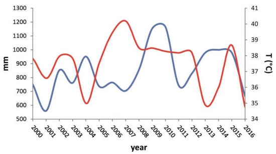 Comparison between the curves of rainfall height per year (mm) and annual temperature range (°C) in the period from 2000 to 2016. It is noted that, generally, the wettest years correspond to a smaller temperature range and vice versa, sometimes with a phase shift of about a year.