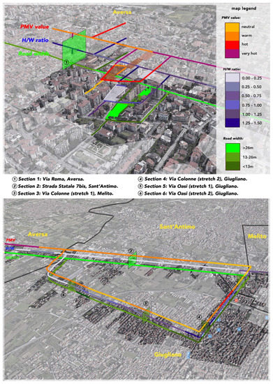 Along the State Road 7 bis outside of the historic centre of Aversa, the existing buildings minimally shade the sidewalks but not enough to shelter in the hottest periods of the day, while the values of the PMV and the average radiant temperature indicate a far worse condition than in the more densely urbanized areas. The road Section 6 on Via Oasi (also typical of the area immediately outside of Aversa) currently contains parking, street hardware (lighting, etc.), and tree rows intermittent on both sides (see Section 6 in Figure 7 and Figure 9). The street redesign provides for a two-way bike path extension on one side of the road, and green infrastructure, rows of Tilia Cordata, along both sides the roadway. The modeling confirms that in addition to absorbing all the rainwater runoff, pedestrians and cyclists are protected from the sun and isolated from vehicular traffic, making the path safe, while, nonetheless, leaving vehicle parking areas.