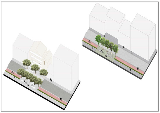 At the opposite end of the study area, in the center of Giugliano (NA), with similar U.A.R., shading and PMV conditions to Aversa, a different strategy proves possible. As delineated in Sections 3 and 4 (Figure 8), the redesign creates “Urban Green Oases” to collect and control stormwater, enlarging green areas for neighborhoods currently with minimal access to open space (Figure 10). Because of the dense building pattern and narrow streets, a constant shade covers these stretches of Via Colonne in Giugliano. The shade protects pedestrians and bicyclists even in the hottest days of the year and the average PMV values remain at comfortable levels. The redesign inserts a bike path, integrating it with green infrastructure at some points, improving air quality and stormwater management.