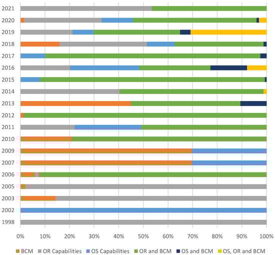 The starting point of interest in OS capabilities (light blue) is 2002, but it is not until 2015 that they remain, consequently, with OS and BCM analysis. Finally, BCM concept relation with capabilities shows a flashing interest, which appeared in 2003, and increasing interest is evident in 2021, with a strong presence in the body of knowledge, allowing us to conclude that contributions to this area can enhance organizational performance during disruptive events, particularly when a relationship with OS capabilities and OR capabilities is established. Finally, the relationship between OS capabilities and OR capabilities with BCM is observed for the first time in 2014, from a supply chain risk management perspective [