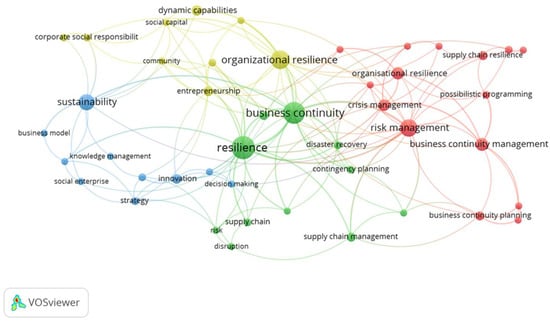 Figure 5, the heat map reveals how keywords interact and concentrate, highlighting “Resilience”, “Business Continuity”, “Organizational Resilience”, “Sustainability”, and “Risk Management.” This is interesting because the role of risk management in business continuity, OR, and sustainability remains, even though this concept is not used in any of the search equations. As Herbane mentioned [