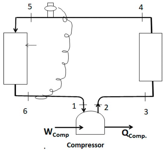 The mass flow rate and values of state functions around the CV for each heat pump component are obtained from the HPDM model. The application of Equations (3)–(6) to the particular heat pump component and its corresponding state points (see Figure 1) yield the component and systemic irreversibility and energy balances shown in Table 4.