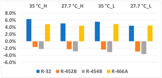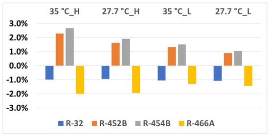 Figure 2 shows cooling capacity variations of the drop-in alternative refrigerant compared to R-410A. R-32 and R-466A result in 4% to 6% higher cooling capacities in all conditions, whereas R-452B and R-454B lead to approximately 2% smaller capacities.