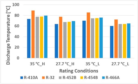 Figure 3 shows increments in cooling COPs. With the same heat exchangers, larger cooling capacity tends to cause higher condensing temperatures and lower evaporating temperatures, degrading the efficiency because the temperature lift is higher. Consequently, R-32 and R-466A have larger volumetric capacities at the expense of reduced COPs. R-452B and R-454B result in higher COPs. Figure 4 presents the compressor discharge temperatures. R-32 has significantly higher discharge temperatures, up to 16.67 K (30R). The other alternative refrigerants show slightly higher temperatures, up to 5.56 K (10R). At the low speed, the discharge temperatures are lower than those at the high speed, because the condensing temperature is reduced at the part-load operation. Figure 5 compares the seasonal cooling COPs, calculated from AHRI 210/240. They differ slightly, ranging from 4.45 to 4.58. R-454B results in the highest COP, and R-466A results in the lowest COP.