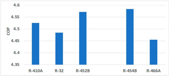 It is technically feasible to replace R-410A (GWP 1934) with lower-GWP refrigerants (Table 2) without changing the heat-pump hardware. Cooling capacity increments of the drop-in alternative refrigerant compared to R-410A are 4% and 6% better for R-32 and R-466A, respectively, and 2% worse for R-452B and R-454B, respectively.