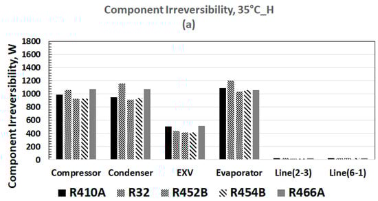 We conclude that seasonal cooling COPs, calculated using AHRI 210/240 specifications, show slight variation from 4.45 to 4.58. R-454B results in the highest COP, and R-466A results in the lowest COP (Figure 5). Systemic irreversibility calculated from using both the first and the second laws of thermodynamics pointed toward slightly lower compressor irreversibility with R-452B and R-454B, relative to the other refrigerants, for high and low compressor speeds. Evaporator irreversibility exceeded compressor irreversibility, except for the 35 °C low-speed condition, where it was marginally less. The conclusion from the irreversibility analysis strongly suggests that to mitigate lost work, it is essential to focus on heat exchanger technology to reduce the condenser and evaporator irreversibility. The total systemic irreversibility is least significant for R-452B and for R-454B, for all conditions of temperature and compressor speed.
