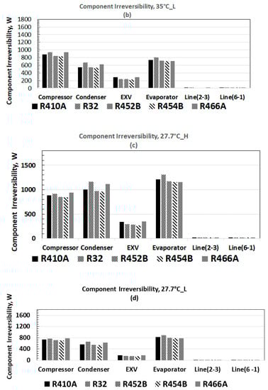 Irreversibility structure of HP components at ambient temperatures specified by AHRI 210/240 standard. (a) 35 °C, high-speed; (b) 35 °; (b) 35 °C, low-speed; (c) 27.7 °C, low-speed; (c) 27.7 °C, high-speed; and (d) 27.2 °C, high-speed; and (d) 27.2 °C, low-speed. Space cooling temperature in all cases is at 26.67 °C, as per standard.