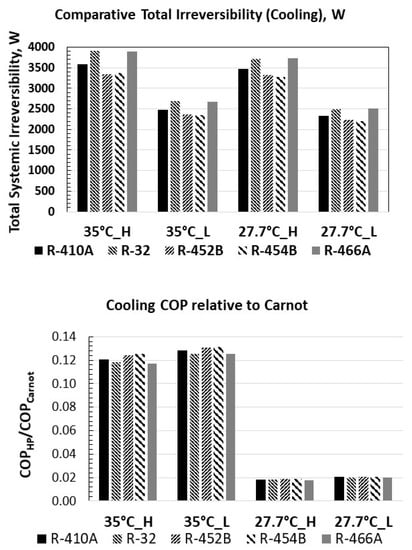 The comparative irreversibility and the cooling COP relative to Carnot for all refrigerants at each AHRI 210/240-rated condition are even more telling (Figure 7). The total systemic irreversibility of R-452B and R-45B are the least significant. Regarding performance relative to Carnot, the pattern is unescapable in going from high (35 °C) to low temperature (27.7 °C), regardless of the speed. At 27.7 °C, the Carnot heat pump efficiency is great, making the relative efficiency compared to the Carnot efficiency small. The opposite is true at 35 °C, where both the Carnot and the HP efficiency are smaller, making their ratio greater.