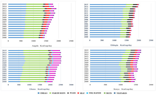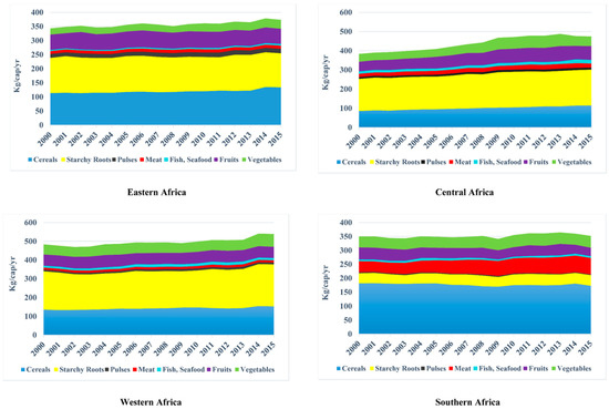There are reported improvements in calorie consumption per capita in sub-Saharan Africa from 2194 kcal per capita in 2000 to 2420 kcal per capita in 2015, albeit low compared to the rest of the world [62]. According to the average dietary energy requirement (ADER), which differentiates countries with sufficient food consumption, a country with a dietary food supply of less than 2000 kcal/cap/day has a critically low supply, between 2000–2500 kcal/cap/day is termed as low supply, an average supply ranges from 2500–3000 kcal/cap/day and a high supply is over 3000 kcal/cap/day [62]. However, from our analysis, SSA have low food supply per capita per year (kg) when compared with its population and the 13 countries assessed further proves insufficiency in their food supply per capita (see Figure 1 and Figure 2). To analyze the food supply per capita, we provide an overview of the scenarios within the 13 countries representing SSA from the MDG period (2000–2015).