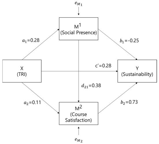 Finally, the bootstrap CIs generated by the PROCESS macro for all indirect effects are reported in Table 3. The first indirect effect, labeled “Ind1,” is the specific indirect effect of TR on sustainability, through SP perception (X→→Y). Unexpectedly, we find a negative and significant indirect effect (lower-level CI = −0.12; upper-level CI = −0.02). Although this indirect effect is statistically significant, we consider this unexpected relationship to be an artifact, due to the possible statistical suppression effect that arises when the overlapping variance between two predictors is large [64]. The following evidence supports our inference on the results for “Ind1”: first, the correlation coefficients between TR and SP and between SP and sustainability are 0.19 (p < 0.01) and 0.01 (n.s.), respectively; second, conducting a single mediator model (PROCESS macro model 4) did not produce any significant results (Direct effect = 0.11, SE = 0.13, p = 0.41 [LLCI = −0.15, ULCI = 0.36]; Indirect effect = 0.01, Boot SE = 0.03 [BootLLCI = −0.04, BootULCI = 0.07]). The second indirect effect, labeled “Ind2,” is the indirect effect of TR on sustainability through course satisfaction (X→→Y). Unfortunately, the bootstrap result again does not support Hypothesis 6, as the bootstrap CI includes zero (BootLLCI = −0.06, BootULCI = 0.23). Finally, the third indirect effect, labeled “Ind3” (X→→Y), is the indirect effect of TR on sustainability through perception of SP and course satisfaction in serial. The bootstrap results of the third indirect effect support Hypothesis 7 (BootLLCI = 0.03, BootULCI = 0.13). Therefore, consistent with Hypothesis 7, TR predicts sustainability only through serial mediators. More specifically, TR benefits sustainability only, as it enhances perception of SP when participants attend classes on a virtual meeting platform, and SP increases the likelihood of feeling satisfied with the virtual teaching method.