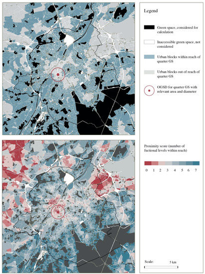 Figure 1. Urban blocks within reach of quarter green space (top) and proximity score of urban blocks (bottom).