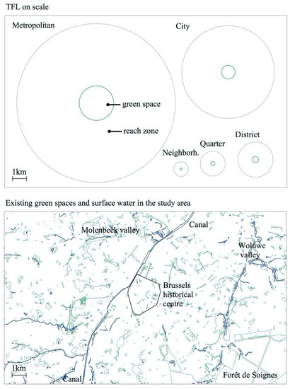 The methodology involves concepts that are explained more in-depth first. The proximity model is the GIS-based model that was developed by the authors [25] for producing indicators for proximity of green spaces on different Theoretical Functional Levels (TFL). The notion of TFL relates the distance to GS that a resident is willing to cover to the size of the GS. The rationale behind this approach is that the size of a GS determines the range of functions or activities the GS may potentially support. It is assumed that residents will be prepared to cover longer distances to reach a larger GS, because of its improved offer in terms of amenities, potential uses, and benefits [25]. This idea is supported by several empirical studies [19,42]. In the proximity model used in this study, seven theoretical functional levels (TFL) are defined, from the residential to the metropolitan scale, each corresponding with a minimum size and maximum distance, the latter obtained empirically (Table 2, Figure 1). Design is used in this study to test possibilities for creating GS and for testing these propositions against the multiple preconditions concerning development of GS. GS that are proposed on suited locations as a solution for the lack of GS on a specific TFL are named Opportunities for Green Space Development (OGSD). When a specific set of OGSD is chosen for impact analysis, it is called a scenario.