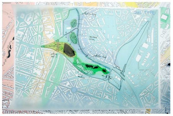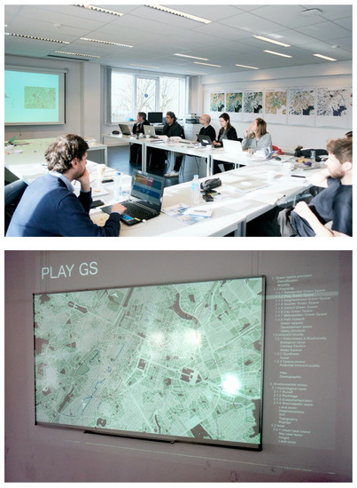 Table 4 provides an overview of the different steps in the methodology and the materials used in each step. The RbD was performed in two parts: (i) during an interdisciplinary workshop (Figure 3) with twelve participants, including researchers (e.g., architects and urban designers, planners, hydrologists, geographers), students in architecture and urban design, people from the regional office for environment, and regular citizens—here, proximity maps per TFL were projected on whiteboard for drawing GS development scenarios; (ii) during a smaller session (one researcher and one student) on GIS analysis, for processing the workshop outputs, and for additional scenario work. Complex solutions were further tested in AutoCAD. Based on the interventions needed for the realisation of the green space, OGSD were classified according to investment scale, from regular investment to high additional costs. The development options include both traditional GS planning options and more intricate options that can be considered in case a traditional solution is not spatially possible. One of the goals of the exercise is to explore which degree of complexity of solutions is needed to provide sufficient green space accessibility in the most challenging areas. The spatial as well as demographic impact was then assessed for the whole study area as well as for two socio-economic groups in the BCR.