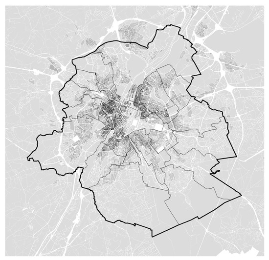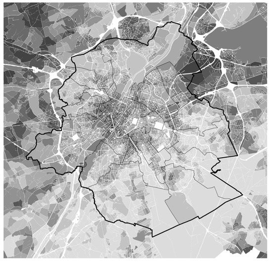 Figure 4. Proximity score at urban block level (dark 0–7 light). Lines: Brussels-Capital Region (thick) and the 19 municipalities it is composed of (thin) ↑ North—Scale: 5 km.