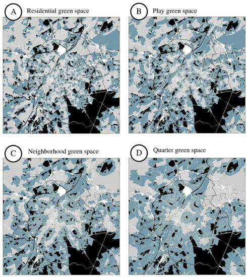 Figure 6. Urban blocks within reach of seven levels of public green space (continues on the next page, including legend). Residential green space (A), play green space (B), neighborhood green space (C) and quarter green space (D).