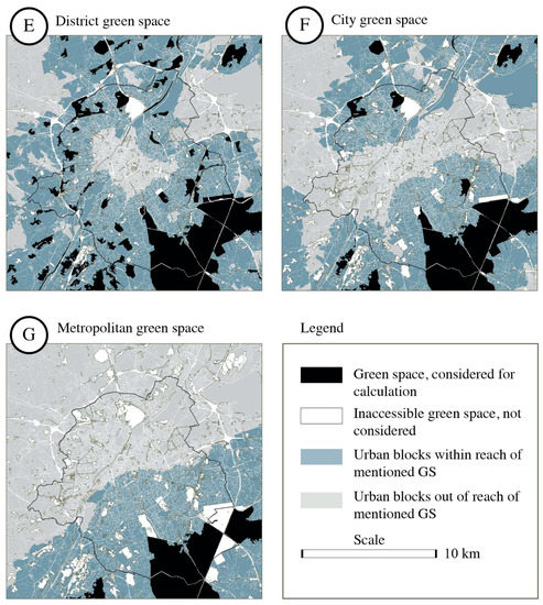 Figure 7. Urban blocks within reach of seven levels of public green space (continuation of the previous page). ↑ North. District green space (E), city green space (F) and metropolitan green space (G).