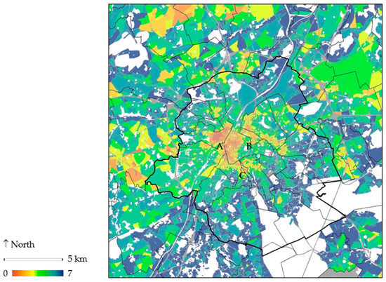 The current state of GS proximity is described in detail in Stessens, Khan, Huysmans and Canters [25]. To summarise, there is a strong lack of public GS in the area including East Molenbeek and the west of central Brussels (area marked as A in Figure 9) and to a lesser extent in Sint-Joost-Ten-Node (Figure 9B) and the Hallepoort-Louise-Matongé area (Figure 9C). A few patterns are the cause of this: (i) district GS is not present in the central parts of the BCR; (ii) city GS only occurs along the northwest and southeast border of the BCR, resulting in a southwest-northeast oriented axis with reduced accessibility to higher-level green spaces; and (iii) metropolitan GS is absent in the north, leaving the northern part of the BCR underserved [25]. Residential GS and play GS have more irregular patterns of coverage, yet are less well represented in dense urban areas, which in combination with the lack of other TFL reinforces the occurrence of problem areas. Results reveal that even though it is difficult to reach a good green space provision for poor neighbourhoods, it is not impossible within the current urban fabric of Brussels.