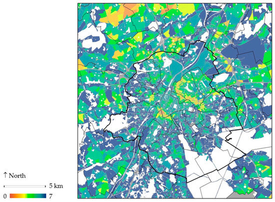 The BASE scenario mostly resolves the lack of public GS in the periphery, though very little in the BCR itself (Figure 9). This is mainly due to the open space scarcity in the highly urbanised BCR implying more costly solutions. The SUPP scenario significantly improves the lack of public GS in East Molenbeek as well as west of central Brussels but does not fully solve the lack of GS in the Hallepoort area and Sint-Joost-Ten-Node and leaves Schaarbeek with a low proximity score (Figure 10). The FULL scenario solves the lack of GS proximity by bringing most urban blocks to a score 4–5 (Figure 11). Some of the peripheral agricultural areas keep low values, which is mainly due to the large units of land. This increases the average distance between the perimeter of the urban block and public GS. A reiteration of public GS placement or creating a finer path network could solve this issue. The average proximity score is 3.1 for CURR, 3.5 for BASE, 4.3 for SUPP, and 4.7 for FULL.