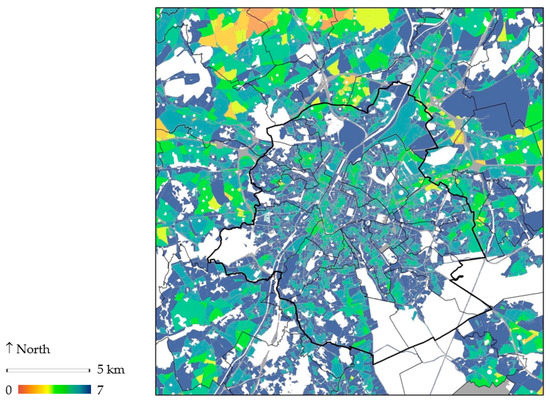GS proximity is modelled according to the procedure described in Stessens, Khan, Huysmans and Canters [25] and its standards. A visual representation of the existing public GS and TFL Spatial indicators/maps produced by the model are calculated at the level of urban blocks and include identification of all urban blocks having a specific level of GS within reach (Table 2, Figure 2, top), as well as an overall proximity score ranging from 0–7, indicating for each urban block how many of the seven TFL are accessible (Figure 2, bottom). It is important to note that functional levels form a hierarchy, where it is assumed that higher-level GS also offer the functions of lower-level GS. For example, district GS are also considered in the calculation of access to neighbourhood green, applying the maximum distance threshold for the latter. For the design exercises, the proximity indicator maps (model output) were complemented with an aerial image of Brussels at 25 cm resolution. Additional layers that were used for location finding of new GS are: a base map including buildings, parcel boundaries, and existing GS (Figure 1), the public transport network (rail, metro, tram), surface water (streams and water bodies), protected landscapes and nature reserves, a noise map (road, rail, and air traffic), and the biological valuation map (Table 3).