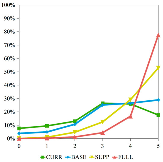 Figure 12. Share of population that has 1–5 TFL of public green space within range for CURR and scenarios BASE, SUPP, FULL.