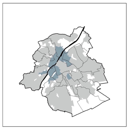 Figure 13. Urban blocks in neighbourhoods with TOP75 (grey) and BOT25 (blue) average incomes; the Brussels Canal is shown in black. No data is shown in scarcely populated statistical sectors (white). Scale: 5 km.