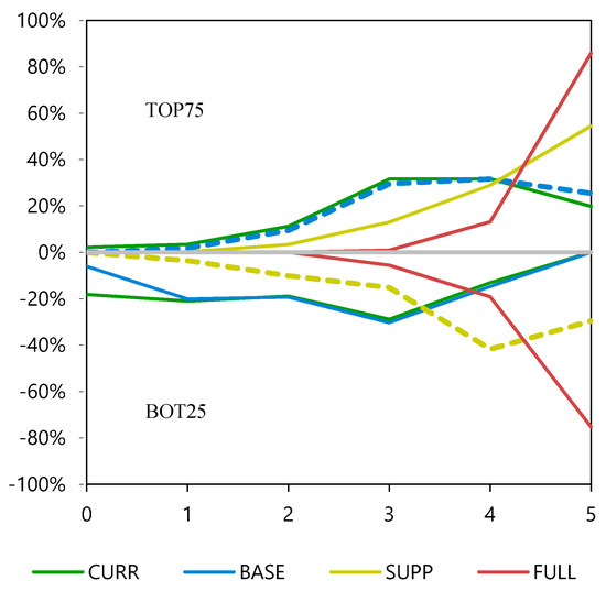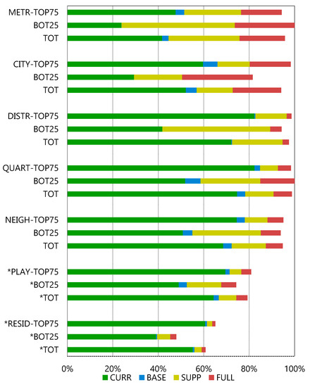 In Figure 14, the influence of income on public GS accessibility is shown for the current situation, along with the potential of the three scenarios for improving access to public GS in low-income vs. medium-to-high-income neighbourhoods. For each category, the population percentage with GS of different TFL within reach is shown for the current state (CURR) and for each of the three scenarios (BASE, SUPP, FULL). The lowest TFL residential GS and play GS, for which no interventions are proposed in the scenarios, show an increase in reached population due to the fact that higher TFL are considered as covering the functions of lower TFL if they are within reach [19,25]. In the current state (CURR), metropolitan GS, city GS, and residential GS are the lowest-performing TFL region-wide with, respectively, 42%, 52%, and 55% of the population within reach. However, it is possible to elevate the reach of the five highest TFL to a very high level in the FULL scenario. In CURR, the average accessibility for all TFL for the BOT25 group in terms of fraction of the people reached is about 40% lower than for the TOP75 group (Figure 15), meaning that inhabitants living in the lowest-income neighbourhoods are strongly disadvantaged in terms of public GS access. Access is especially low for the BOT25 group for city and metropolitan GS (Figure 14). The BASE scenario has nearly no impact (3%) in terms of improving people’s access to GS overall. The SUPP scenario, on the other hand, leads to a substantial increase in accessibility for the five highest-level TFL, especially for BOT25 neighbourhoods, where the scenario impact is much higher than for the TOP75 group (Figure 16). In addition, for the FULL scenario the gain is higher for the disadvantaged BOT25 group than for the TOP75 group, restoring the balance for both groups in terms of access to GS for most TFL. Only city green and residential public GS access remains lower for BOT25 than for TOP75 (Figure 16).