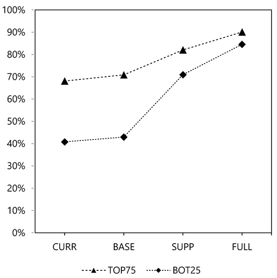 Figure 15. Average fraction of people reached for all TFL in each scenario for low-income (BOT25) and for medium-to-high-income groups (TOP75).