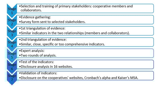 The research was qualitative for building the list of sustainability indicators. Figure 1 shows the seven steps of collecting and analyzing evidence.