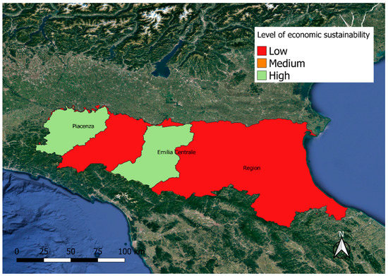 The image shows the level of economic sustainability for each area. Higher values are in green, lower values are in red.