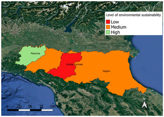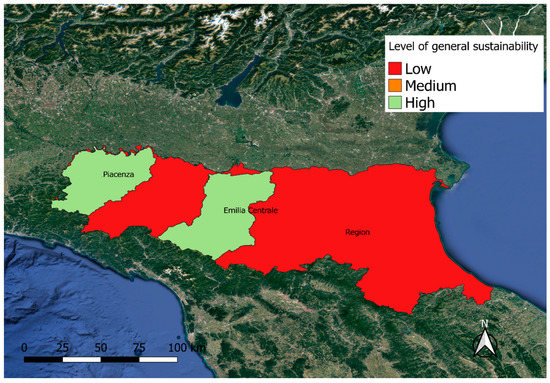 At this point we carried out the assessment of global sustainability by making an overlap of the three components. The overlap was carried out, again through SSAM, by giving the same importance to all three dimensions. A general sustainability map was then generated, shown in Figure 8. As can be seen, despite the poor environmental sustainability of the Emilia Centrale reclamation consortium, both consortia had an excellent general sustainability value when compared with the regional average.