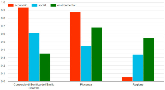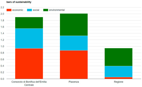 The second graph, called Bars of sustainability (Figure 6), presents the same results as the previous one in a different way. Specifically, the three components are overlapped; this results in a visual ranking among the different areas, it points out that the consortia reached higher levels in the sum of the three indices, compared to the region, whose level was much lower. It is already possible to visually predict the general sustainability index. However, the contribution of each individual component is very clear, as they remain with a distinct color. The heights of the two consortia are more or less the same but the contributions of the three components are very different because in the consortium of Emilia Centrale, compared to that of Piacenza, the social component prevailed at the expense of the environmental one.