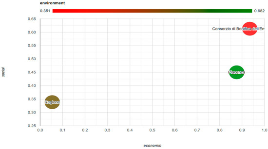 The last graph presented is called the Bubble Graph (Figure 7), which presents the same values of the previous two but allows us to see more easily the three dimensions at the same time. On the x-axis we see the values of the economic CC reported. This means that the more an institution is moved to the right, the greater the performance from an economic point of view. On the y-axis we see the value of the social CC reported. It can therefore be easily seen that the Emilia Centrale consortium had excellent economic and social performance. The color of the single bubble instead gives an idea of what the result of the environmental index is: if the color is green, it means a good value (Piacenza), if instead it is red, performances were poor from the environmental point of view (Emilia Centrale).