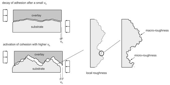 Adhesion is caused by various chemical and physical mechanisms in microscale (e.g., covalent or ionic bonds, Van der Waals forces) and is dependent on the properties of the new and old concrete, and the quality of substrate, as well as wettability, permeability and moisture content of old concrete substrate [20,25]. The cohesion is activated after the decay of adhesion with a relative horizontal and vertical displacement of the interface and is mainly affected by the mechanical interlocking caused by micro- as well as macro-roughness (compare Figure 1) [26]. The friction in the contact area is activated in a macroscopic scale only in the presence of lateral compression, which is of secondary importance for flexural members with concrete overlays.